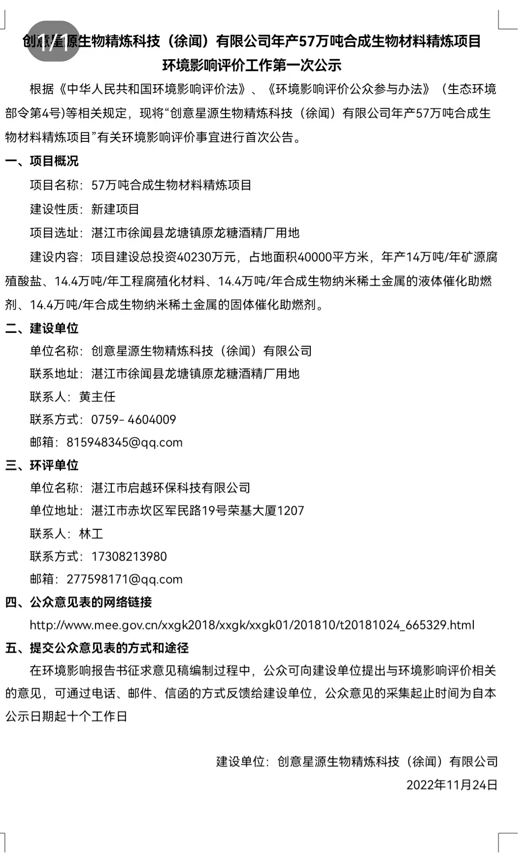 創(chuàng)意星源(徐聞)合成生物材料精煉項(xiàng)目環(huán)評(píng)公示